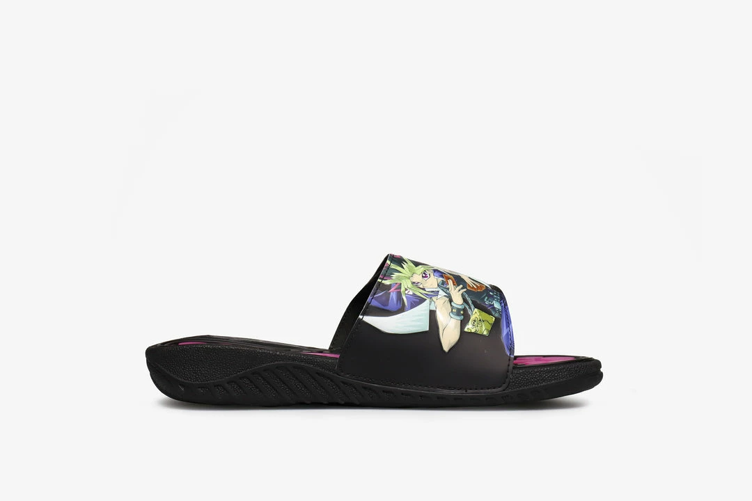 As ’90s as Y2K and dial-up internet. These adidas Reptossage Slides bring back an obscure style from 1999 and combine with the retro aesthetic of the Yu-Gi-Oh! trading card game and animated show hit.ย The PVC footbed stands out in bright neon purple. An EVA midsole and synthetic bandage keep your feet comfy.ย
