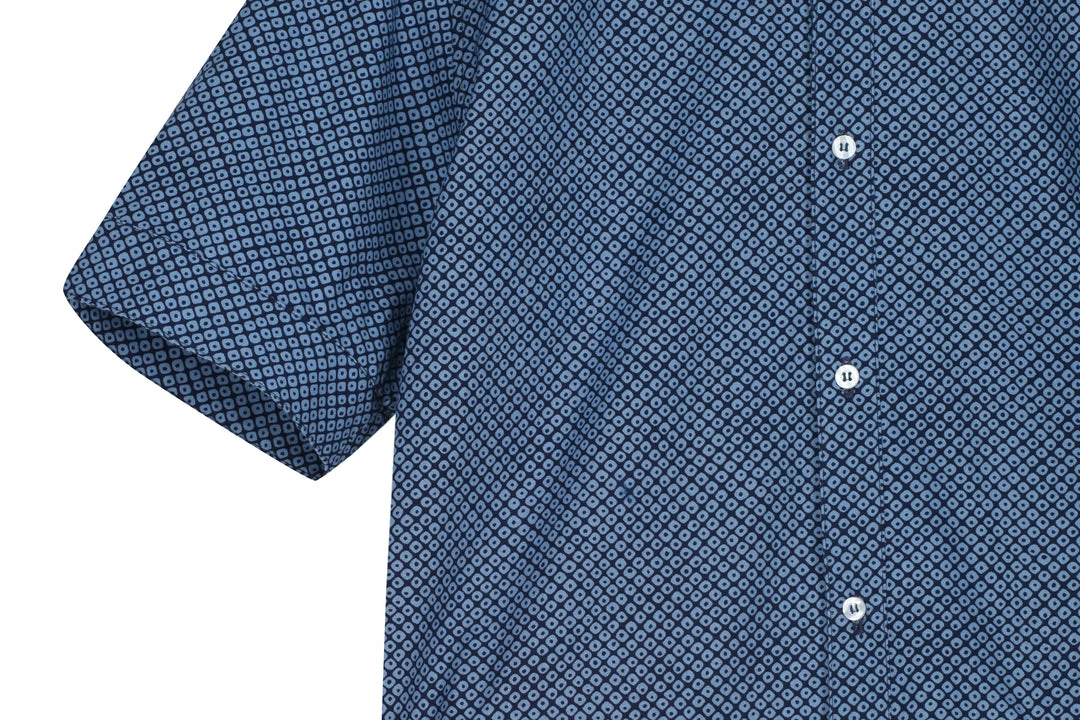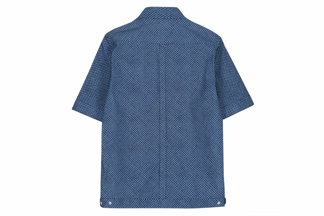 Anglozineβs neighbourhood Bethnal Green was deserted when they started to put season 6 together back in March 2020.Β Marooned in a locked-down area daydreams about J.G.Ballards imagined tropical London desert served as a centrepiece to this seasons collection. Here we the Sud Cuban SS shirt an Anglozine Summer classic, boasting an all over indigo fabric with horizontal front pockets with Aertex lining, side adjusters and an 8 button front closure.Β