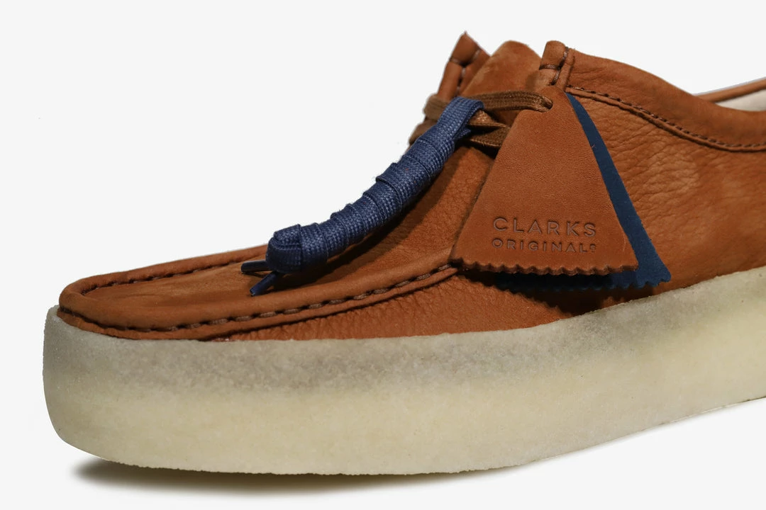 The street-inspired Wallabee Cup takes on a striking new warm tan hue – with pops of colour thanks to the additional laces, material fob and heel tape coming in a deep navy which contrasts the rest of the shoe nicely. Below a standout cupsole meets the upper half way providing the shoes with added durability and a unique look.