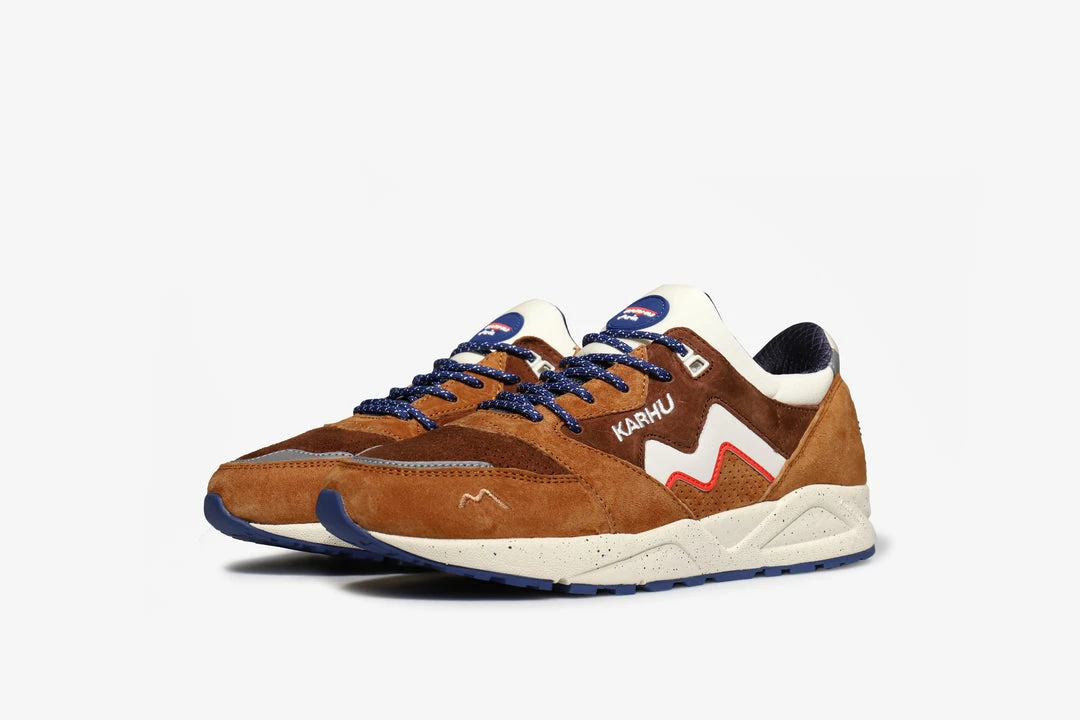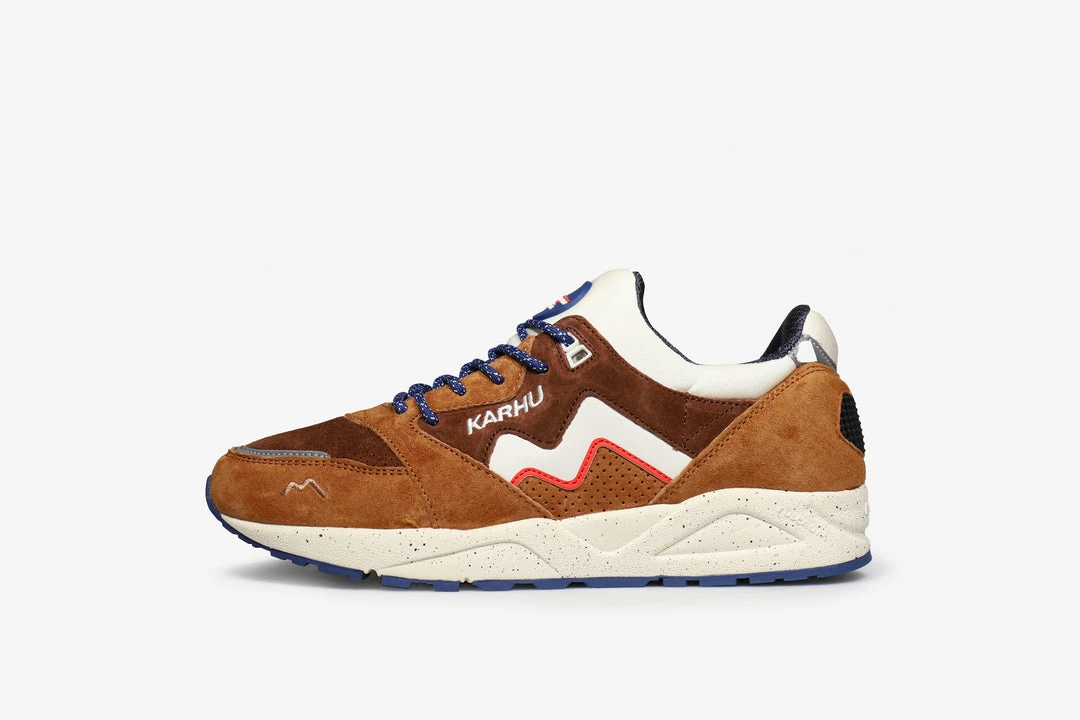 The Aria 95, known for its mono-sock construction, is decked out in a mix of suede, lycra and mesh as well as featuring rope laces. This pair from the SS22 drop boasts a rich texture and harnesses both darker & lighter hues of brown, with a pop of red that all merges tastefully together to createย a bona fideย show stopper. Branding o the tongue comes in aย contrasting navy, the same colour can also be found on the rope laces that weave through the shoes three material upper. A speckled off-white midsole with a navy outsole ties the whole composition together effectively.