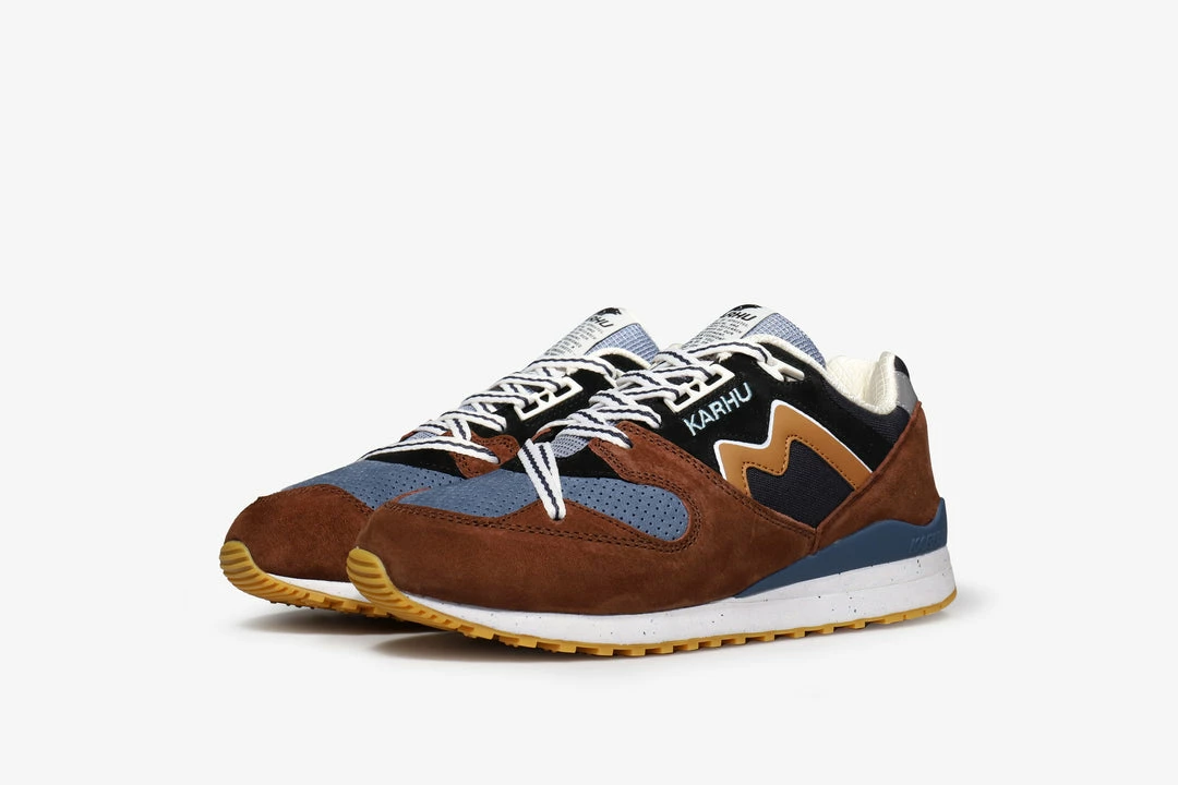 With the Autumn winds sweeping in, the forests begin their transition from vibrant greens to a plethora of fine reds, oranges and browns. With this in mind, the team at Karhu have created a capsule of Autumnal inspired colourways that aim to reflect the transitional period into the colder half of the year.ย The Karhu bear won’t be hibernating this winter, expect more quality to come.ย The Synchron Classic’s dual density construction remains true to the original version from the early 1990s, also making use of a double density air-cushioned midsole which provides extra comfort and support. The mesh and suede upper come in a combination of browns and blues, with the Karhu ‘Mestari’ Logo in a tonal light brown hue. The Synchron lacing system passes over the toebox for a unique finish.ย