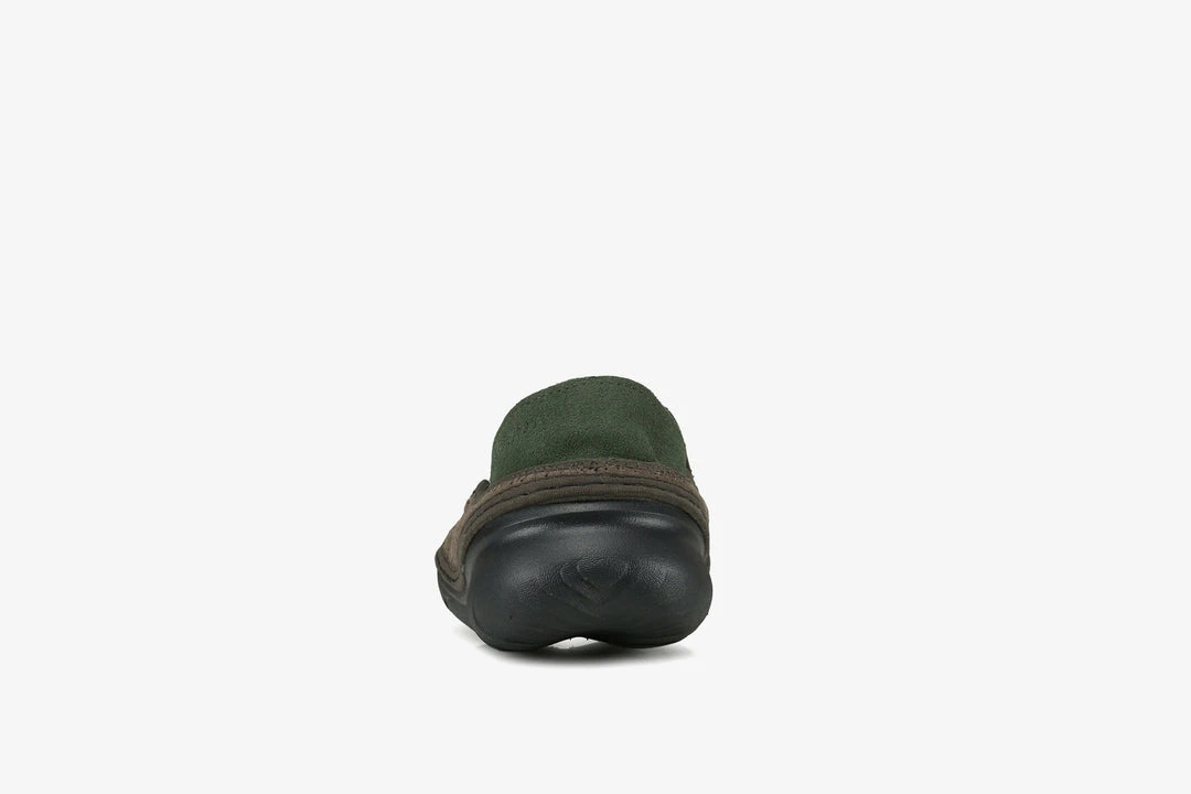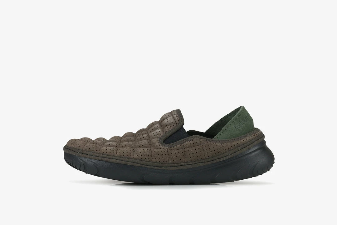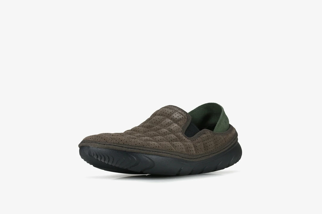 The Hut Moc serves as the most casual of the 3 upcoming offerings from Adsum and Merrell, designed for slipping on after a long day up the hills, the Hut Moc is everything your feet need and want after being tied up in walking boots for hours. The ultra light slipper features an EVA outsole and a collapsible suede heel section. The espresso brown upper is constructed with breathable perforated suede and the inner uses soft leather with the footbed featuring the ADM logo. Debossed branding can be found on the forestย green heel section of the slipper.