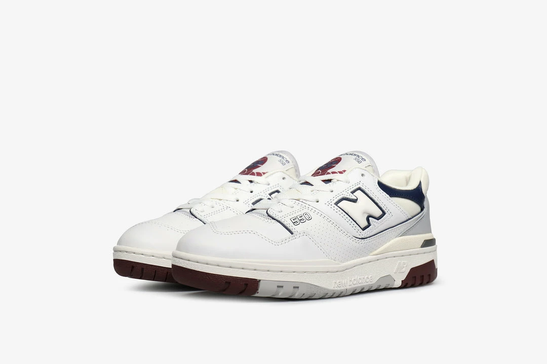 Following its reintroduction, New Balance takes inspiration from the original 550 release in 1989. The shoe features a timeless leather upper, branded tongue label, EVA midsoleย and is finished with an NBย logo on the heel. This pairย boasts a mixture of white,ย navy and grey on the upper with burgundy accents.