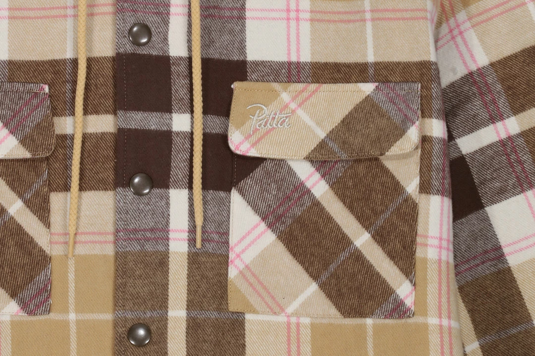 PATTA is back at HANON for AW22Β and oh boy does it look & feel so good.Β Classic concoctions mixed with brand new artwork and designs that will keep you cosy for the winter months ahead. From miniatureΒ embroidery to boldΒ knitted constructions, PATTA continues to focus on creating high quality apparel that is guaranteed to stand the test of time.Β The Plaid Overshirt is crafted from 100% brushed cotton flannel with a satin quilted lining for extra warmth. FeaturingΒ metal snap buttons, a self fabric hood, two chest pocketsΒ and self fabric cuffs with metal snap buttons. An embroidered script logo can be found on the left chest pocket as well as “Team Patta” embroidered across the back.Β