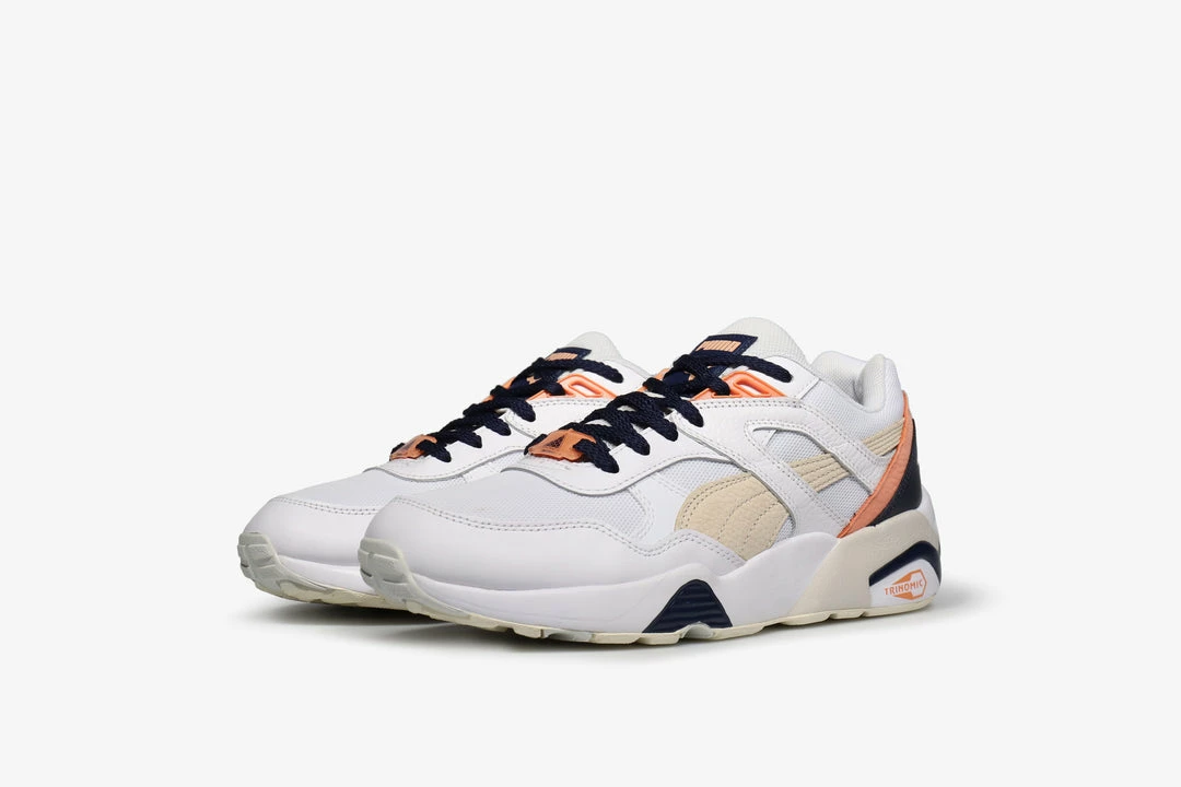 Skate culture meets high tech design with these Puma R698 “Reverse Classics”. The low profile of this shoe supplies a laid-back look that’s paired with a thick sole unit complete with Puma’s Trinomic cushioning technology. The mesh upper is built up with textile overlays and a textured formstrip that slices through the sidewalls. Debossed/printedย logos and a vibrant lace lock supply just the right amount of branding and offer a high energy aesthetic.ย